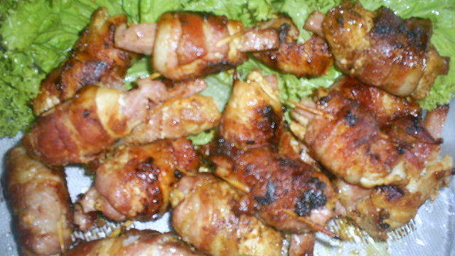 Abra cada fatia de bacon e coloque por cima o file de frango e o presunto e enrole os medalhões e prenda com um palito.