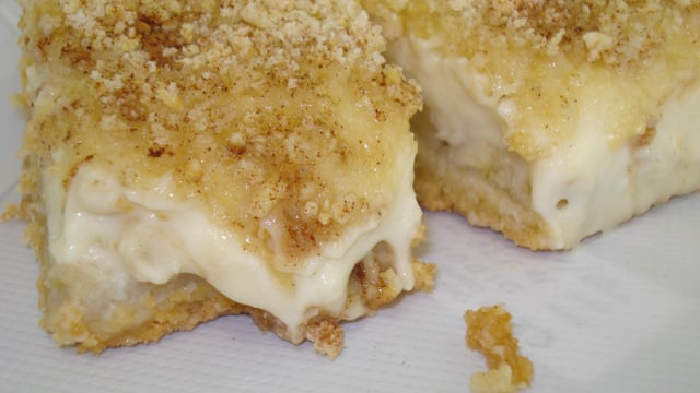 Cubra tudo com a outra metade da farofa e polvilhe canela em pó. Leve ao forno preaquecido a 200°C por 30 minutos. O bolo estará pronto quando bater sobre ele com uma colher e ele estiver um pouquinho crocante!