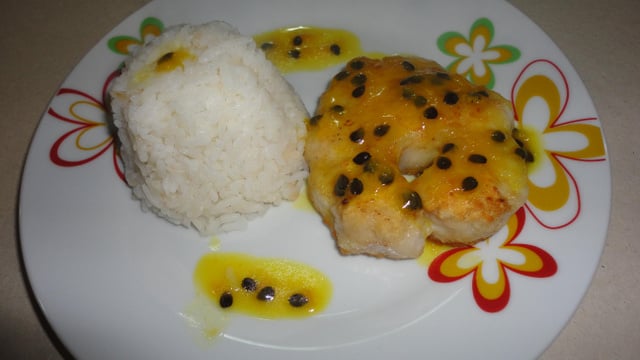 Sirva em prato com o molho de maracujá por cima, acompanhado de arroz branco.