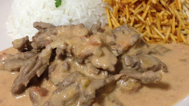 Pique a carne em tirinhas finas, derreta as três colheres de manteiga em uma frigideira grande e frite a carne aos poucos, em fogo alto, sem deixar juntar suco.