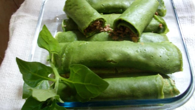 Coloque no liquidificador o leite, os ovos, o espinafre picado o sal, bata bem, em seguida acrescente o trigo e bata mais um pouco, se a massa ficar muito grossa acrescente um pouco mais de leite.