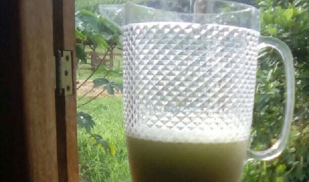Depois coe, coloque a xícara de açúcar e o gelo e bata um pouco e sirva.