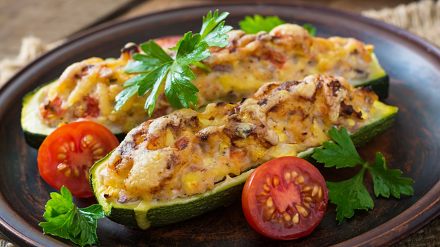 Recheie as abobrinhas co o frango e coloque mussarela picadinha por cima e leve ao forno para gratinhar.