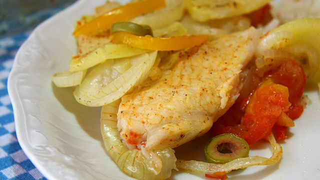 Corte as cebolas, tomates e batatas em rodelas e o pimentão em tirinhas. Forre uma travessa com as cebolas e algumas rodelas de tomate. Coloque por cima os filés. Esfarele o caldo de camarão por cima do peixe. Em seguida, coloque o restante do tomate, as batatas, o pimentão e as azeitonas. Regue com azeite de oliva. Cubra bem a travessa com o papel alumínio e leve ao forno médio para cozinhar. Após cerca de 25 minutos, retire o papel alumínio e aumente o fogo para dourar.
