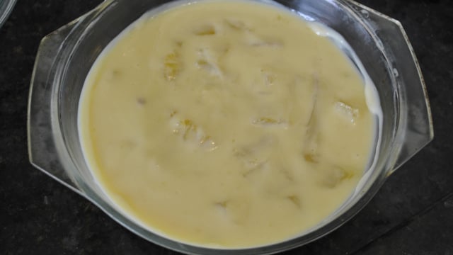 Retire a mistura da panela e coloque em refratário e acrescente o leite condensado e o creme de leite e mistura bem.