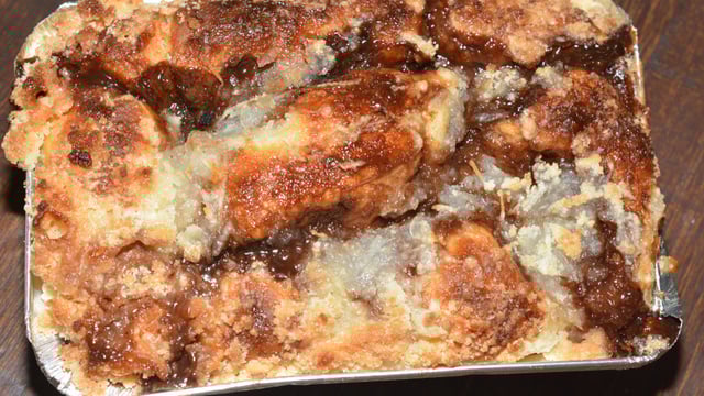 Coloque a farofa de açúcar por cima do recheio (a forofa cobre o recheio por completo: como a farofa leva açucar não é necessário colocar açúcar no recheio, mesmo na massa vai pouco açúcar se não ele fica doce demais).