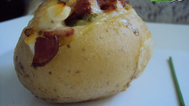 Recheie as batatas. Colocar as batatas recheadas em um refratária untado com azeite e cobrir com papel alumínio. Levar ao forno por 50 minutos ou até assar bem as batatas. Retirar o papel alumínio e deixe até dourar, depois é só servir.
