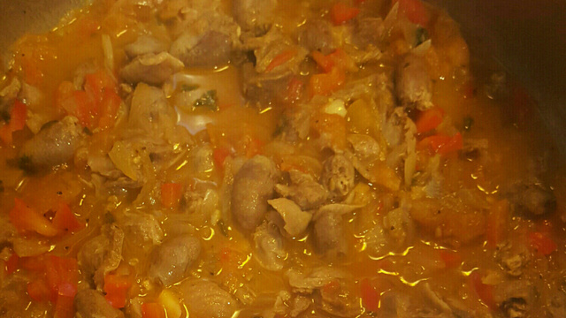 Em uma outra panela acrescente as 3 colheres restantes de azeite, a cebola picadinha e o alho a gosto, frite bem e acrescente o tomate picadinho. Refogue bem até formar um molho e então acrescente as 3 colheres de shoyu. Coloque os miudos e o meio copo do caldo dos muidos e por ultimo acrescente os pimentões vermelho e amarelo, o coentro e a pimenta a gosto, misture bem até formar um refogado com caldo grosso e então é só saborear.