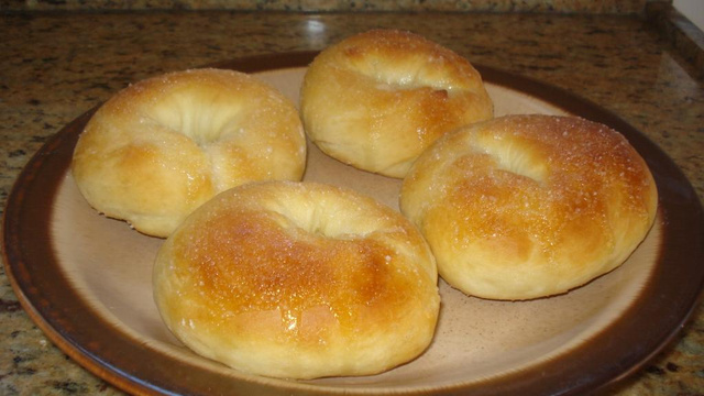 Acrescente aos poucos mais farinha, até a massa desgrudar das mãos e fazer bolhas. Deixe a massa cresce até dobrar de volume (mais ou menos 40 minutos). Depois de crescida, enrole a massa em tiras e faças as rosquinhas. Coleque as rosquinhas em uma fôrma untada e enfarinhada, deixe descansar por maios ou menos 10 minutos e leve ao forno médio até dourar. Depois de pronto, cubra com a calda de açúcar.