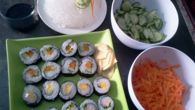 Leve à geladeira por alguns minutos para ficarem mais firmes. Corte os sushis, sirva com o molho shoyu.