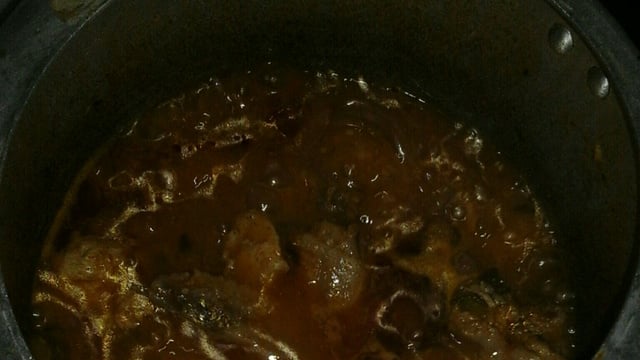 Leve o caldo que se formou ao fogo brando, adicione aos poucos a farinha de mandioca, mexendo sempre, até obter um mingau brilhante e espesso (cerca de 5 minutos) se necessário, adicione um pouco mais de farinha de mandioca.