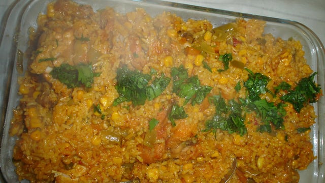 Acrescente cebola, caldo de galinha esfarelado, colorau, arroz tipo agulhinha, pimentão vermelho, cenoura, vagem macarrão, milho verde (sem o líquido) e água quente.
