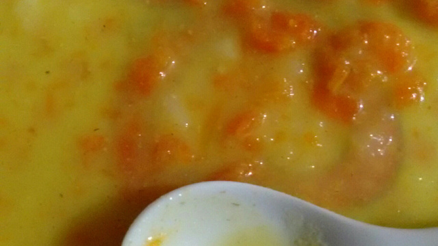 Amasse a batata e a cenoura com o garfo e acrescente o caldo de frango, a cebola e o sal.