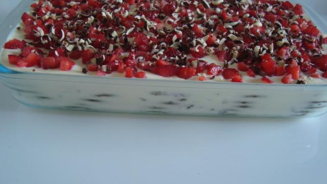 Na última camada, coloque os morangos picados e o chocolate raspado ou granulado.