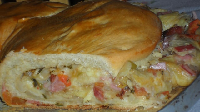 Divida em duas partes, abra, espalhe a mussarela e depois coloque por cima o resto dos ingredientes do recheio, deixar as bordas sem recheio para poder enrolar, enrole e deixe descansar de 25 a 30 minutos.