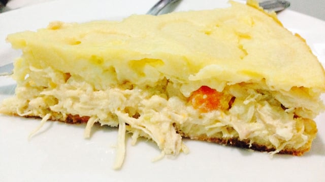 Faça a massa batendo os 7 primeiros ingredientes no liquidificador, unte uma asadeira, coloque uma parte da massa, o frango refogado, a mussarela, depois a outra parte da massa.