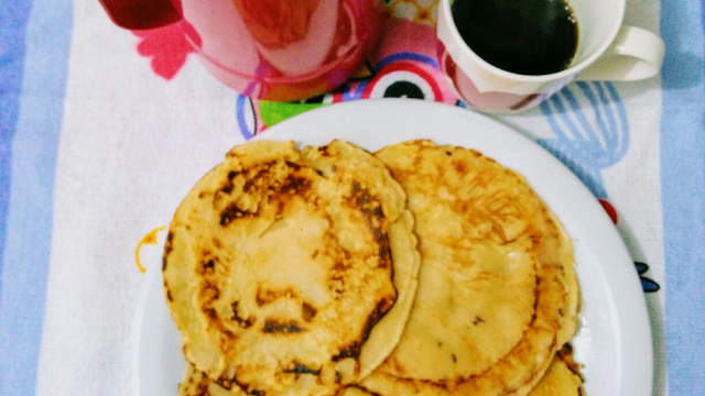 Depois, aqueça o óleo numa frigideira em fogo baixo e coloque aproximadamente meia concha da massa para fritar.