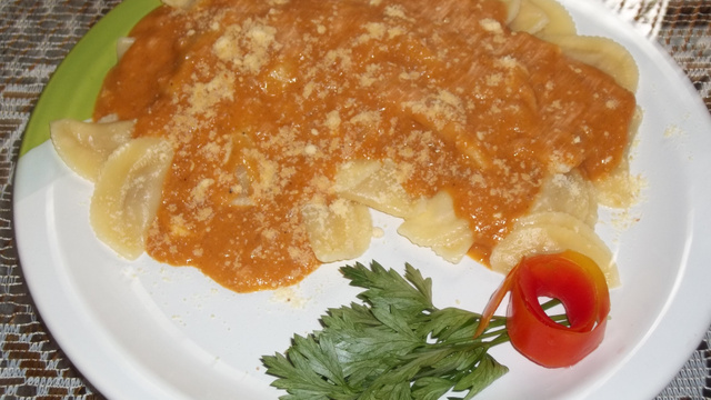 Em um prato coloque o ravióli cozido, coloque o molho a gosto por cima, logo após acrescente o queijo ralado.