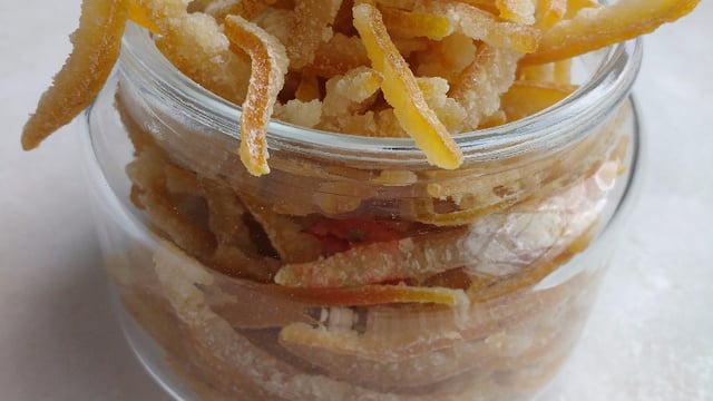 Depois que espumar e a calda estiver grossa de novo tirar do fogo, jogar as cascas sobre um mármore frio e ir abrindo com a espátula até cristalizar.