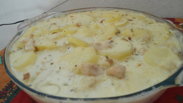 Alterne camadas de batatas, cebolas, mussarela e frango .
