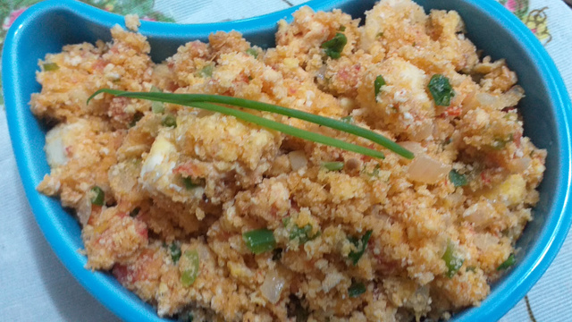 Dê uma mexida, coloque o sal e a pimenta, quebre os ovos e dê uma mexida para ficar uns pedaços de ovos.