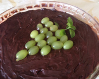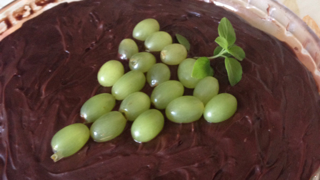 Para a ganache derreta os tabletes de chocolate em banho-maria, acrescente o creme de leite até obter uma mistura homogênea. Espere ficar morno e coloque por cima do brigadeiro com as uvas. Coloque para gelar por 3 horas e sirva a seguir.
