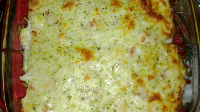 Cobrir com queijo ralado e levar ao forno preaquecido a 180°C por 15 minutos.