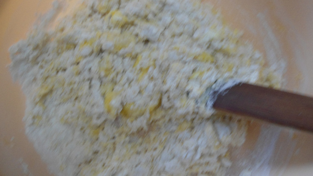 coloque os ovos batidos e com a ponta dos dedos, vá agregando a farinha ate que esteja quase toda incorporada.