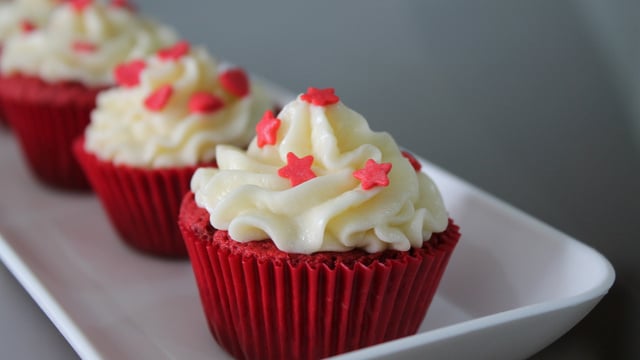 Bater a margarina com o açúcar e ovos até formar um creme claro, reserve. Misturar à parte em uma vasilha os ingredientes secos. Adicionar o corante, a essência, o buttermilk (mistura do leite e o vinagre) e o creme reservado, alternando com os ingredientes secos. Preparar a forma para cupcakes, forrando com os pelotines número 0 (forminhas para cupcake).