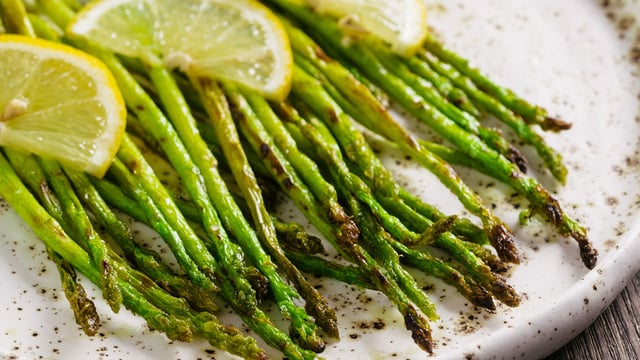 Depois de 10 minutos em brasa vire os aspargos e repita a operação de sapicar sal e pimenta.