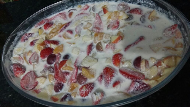 Depois jogue esta mistura nas frutas e misture bem.