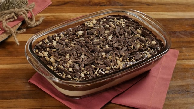 Em um pirex monte a sobremesa assim: uma camada de creme de chocolate, uma camada do creme branco reservado, uma camada de creme de chocolate.