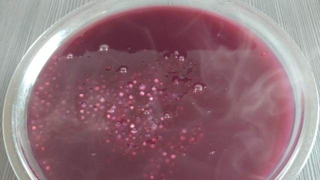 Quando as bolinhas do sagu comecarem ficar grandes e transparentes coloque os sachês de suco de uva, mexa bem.