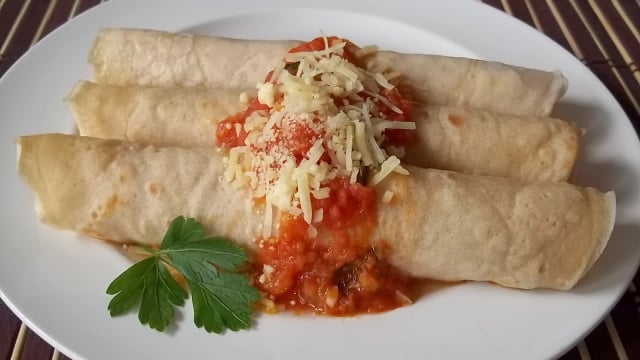 Quando terminar de fritar, colocar o recheio em cada uma,regar com o molho e polvilhar queijo ralado.