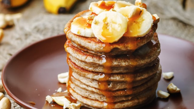 Acrescente as bananas e misture, coloque parte da margarina em uma frigideira antiaderente, coloque um pouco da massa no meio formando um círculo, vire para o outro lado quando estiver dourada.