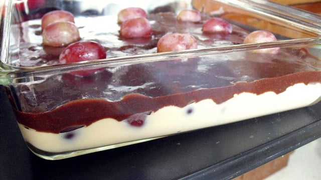 Espalhe-as em um refratário cobrindo bem o fundo, o bom é não usar um refratário muito grande para a camada de uvas ficar grossa. Coloque o creme reservado por cima das uvas.