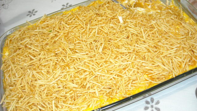 Se preferir pode colocar primeiro a batata palha por cima do creme e depois a mussarela.