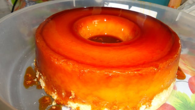 Coloque a mistura na forma com a calda e leve para assar em banho maria por 1 hora e meia.