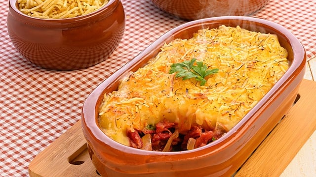 Em um refratário untado com margarina, colocar uma camada do purê da macaxeira, depois uma de charque, mais uma de purê e por último uma camada de queijo, depois polvilhar com queijo parmesão ralado e levar ao forno por aproximadamente 30 minutos.