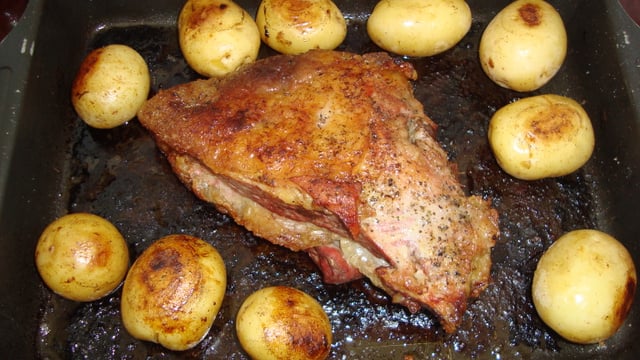 Observação: as batatas, ainda cruas, devem ficar de molho em salmora. Após, devem ser colocadas na forma para assar no momento em que for virar a carne.
