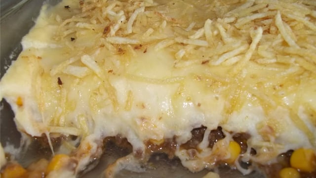Em um refratário coloque uma pequena camada de purê depois coloque toda a carne cubra com fatias de mussarela e coloque o resto do purê, por último coloques mussarela cortadas em tiras e a batata palha.