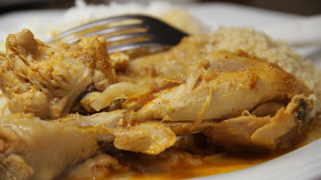 Coloque em uma panela de pressão o frango e os ingredientes, menos o colorau e cozinhe por 20 minutos em fogo alto.