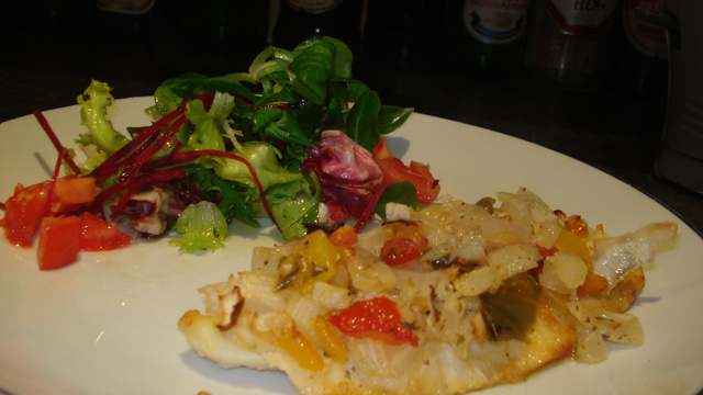 Corte a cebola, pimentão e tomate em quadradinhos e arrume por cima do peixe.
