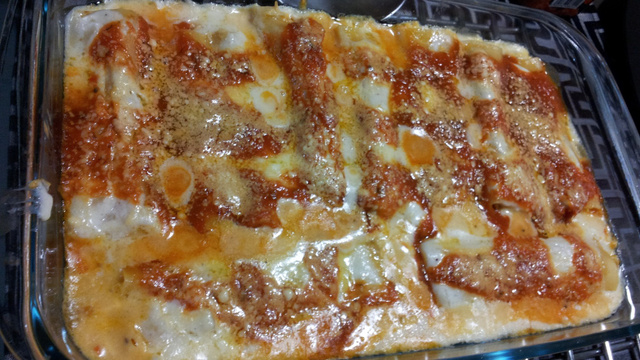 Preencha os canelonis com o frango e faça uma camada única com 1cm de distância entre cada um.