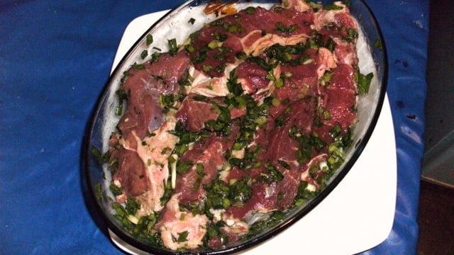 Em seguida espalhe o tempero (alho, sal e cheiro-verde) em toda a peça e reserve.