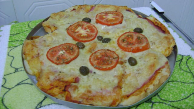 Coloque o presunto, a mussarela, os tomates, azeitonas.