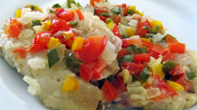 Em uma assadeira anti-aderente, coloque um fio de azeite. Arrume a pescada. Coloque mais um pouco de azeite. Regue com o suco do limão. Por cima, salpique os cubinhos de tomate, cebola e pimentões. Salpique um pouco de sal e regue mais azeite.