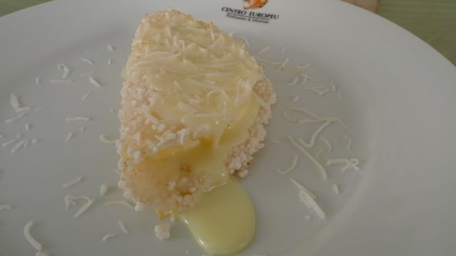 Misture a farinha, o coco ralado e o leite de coco em uma tigela. Aqueça uma frigideira antiaderente, utilizando uma peneira coloque uma camada fina ( como panqueca) da mistura na frigideira e deixe aquecer por aproximadamente 2 minutos. Com a massinha ainda na frigideira coloque o queijo até ficar molinho e cubra com leite condensado, enrole e sirva.