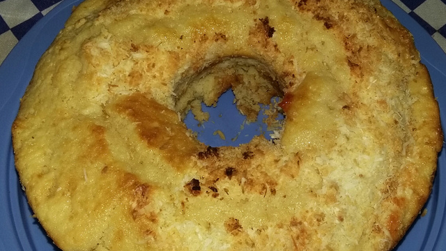 Misture 1/2 xícara (chá) de coco ralado com 1/2 xícara (chá) de queijo parmesão e coloque sobre o bolo.