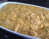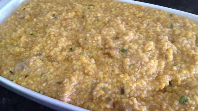 Depois misture o conteúdo da panela de carne com a quirera e sirva.